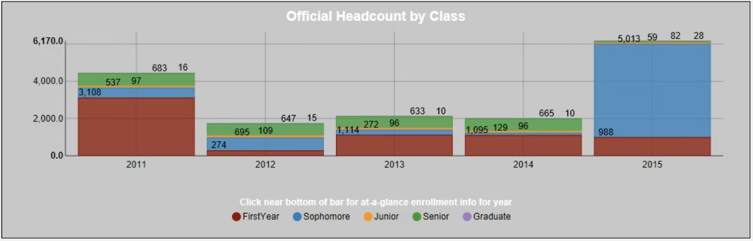 The stacked bar chart shows the official headcount by classification over five years looking at fall semester only. This is useful for answering longitudinal enrollment questions. The stack is the classification, and the bar sections are the years selected.